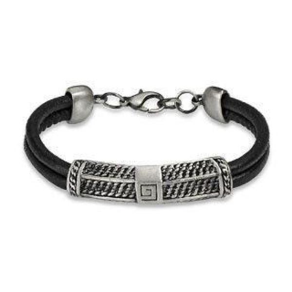 Black Leather Two Strand Bracelet With Scaled Steel Centrepiece